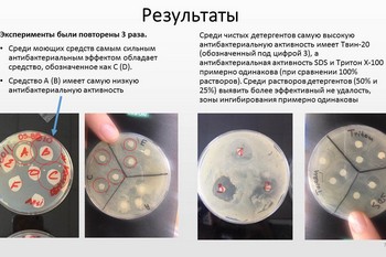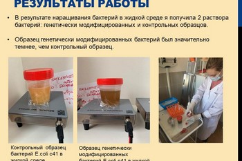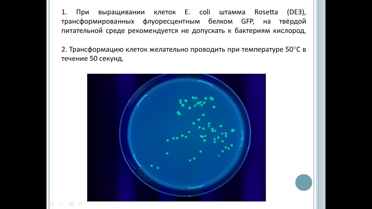 "Влияние температуры и анаэробных условий на эффективность трансформации Esherichia coli ". Гусейнова Эсмер. В своей работе Эсмер показала, что изменений условий стандартной методики трансформации E.coli не только не ухудшает, а значительно улучшает эффективность трансформации. Увеличение температуры, а также создание анаэробных условий, значительно увеличивало количество исследуемых колоний.