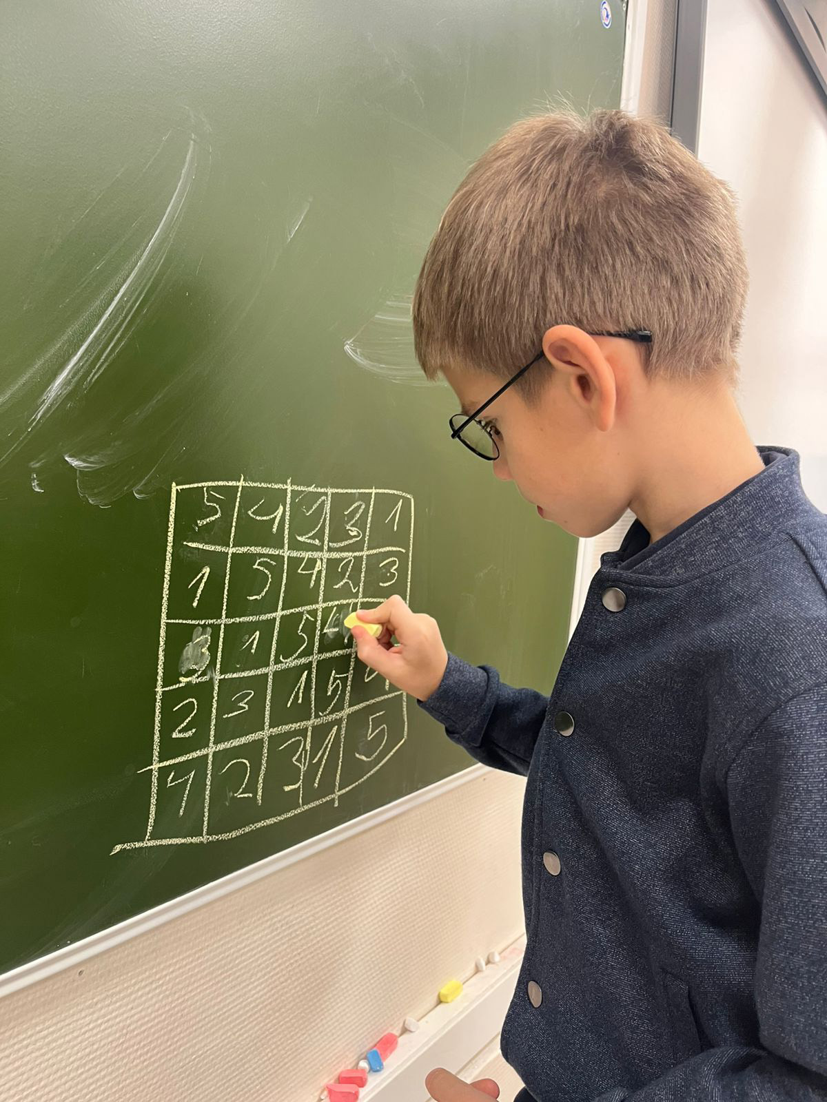 Задача - расставить остальные цифры так, чтобы получился магический квадрат с суммой 15. Для тех, кто справляется быстро, можно дать дополнительное задание: найти другое расположение цифр. Форма работы: в парах или мини-группах.
