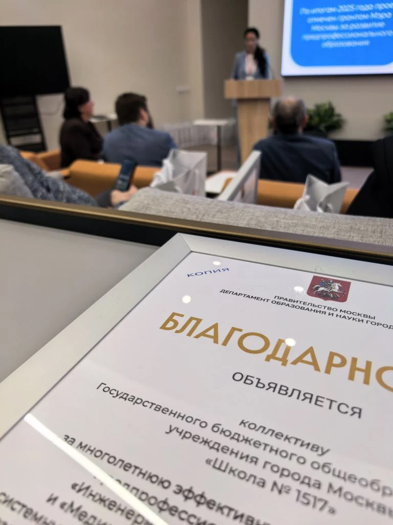 Департамент образования и науки города Москвы отметил работу детско-взрослого коллектива школы №1517 за эффективную подготовку выпускников старшей школы и десятилетнюю работу в команде городского предпрофессионального проекта «Инженерный класс в московской школе».