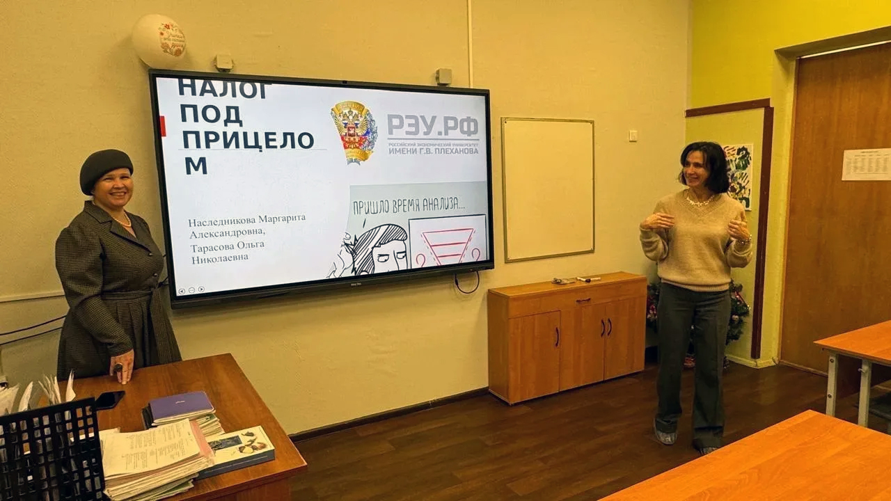 9 декабря 2025 года в нашей школе преподавателями базовой кафедры финансового контроля, анализа и аудита ГКУ г. Москвы ВШФ РЭУ им. Г.В. Плеханова М.А. Наследниковой и О.Н. Тарасовой был проведен профориентационный день, включивший деловые игры, направленные на развитие у старшеклассников компетенций в сфере налогообложения и анализа финансовой информации.